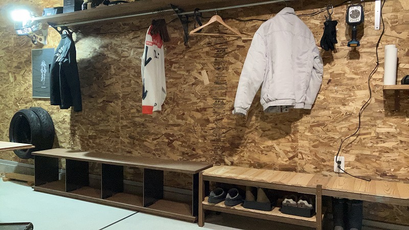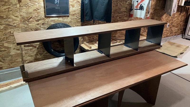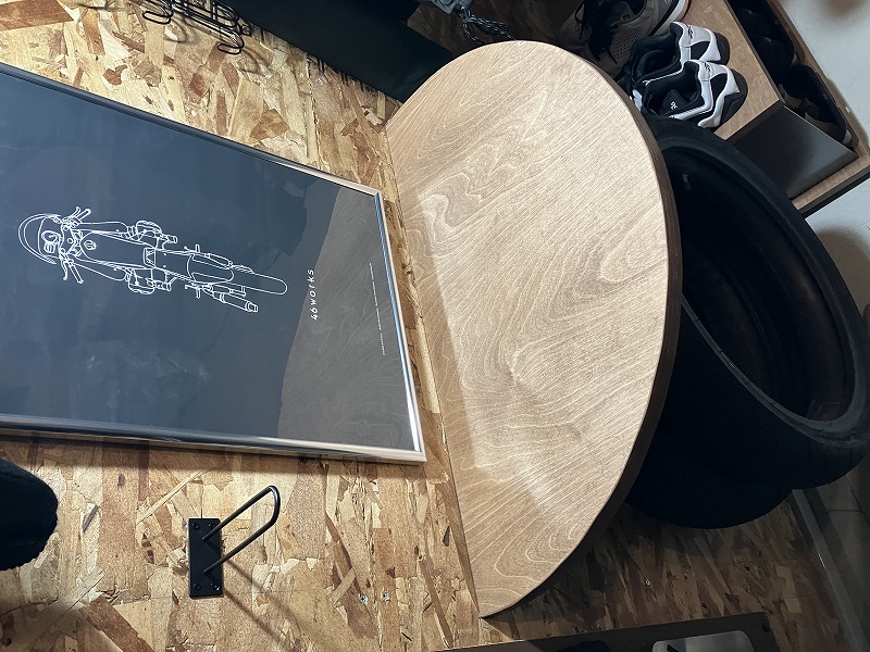 ■バイクガレージのhalf round tableとバーチシェルフ鉄製仕切り □設計 :(株)コスモ 様 □製作 :(株)コスモ 様 □仕様 :B/BB 24mm(プレカット出荷) □コメント :美しい棚でお気に入りのガレージです。